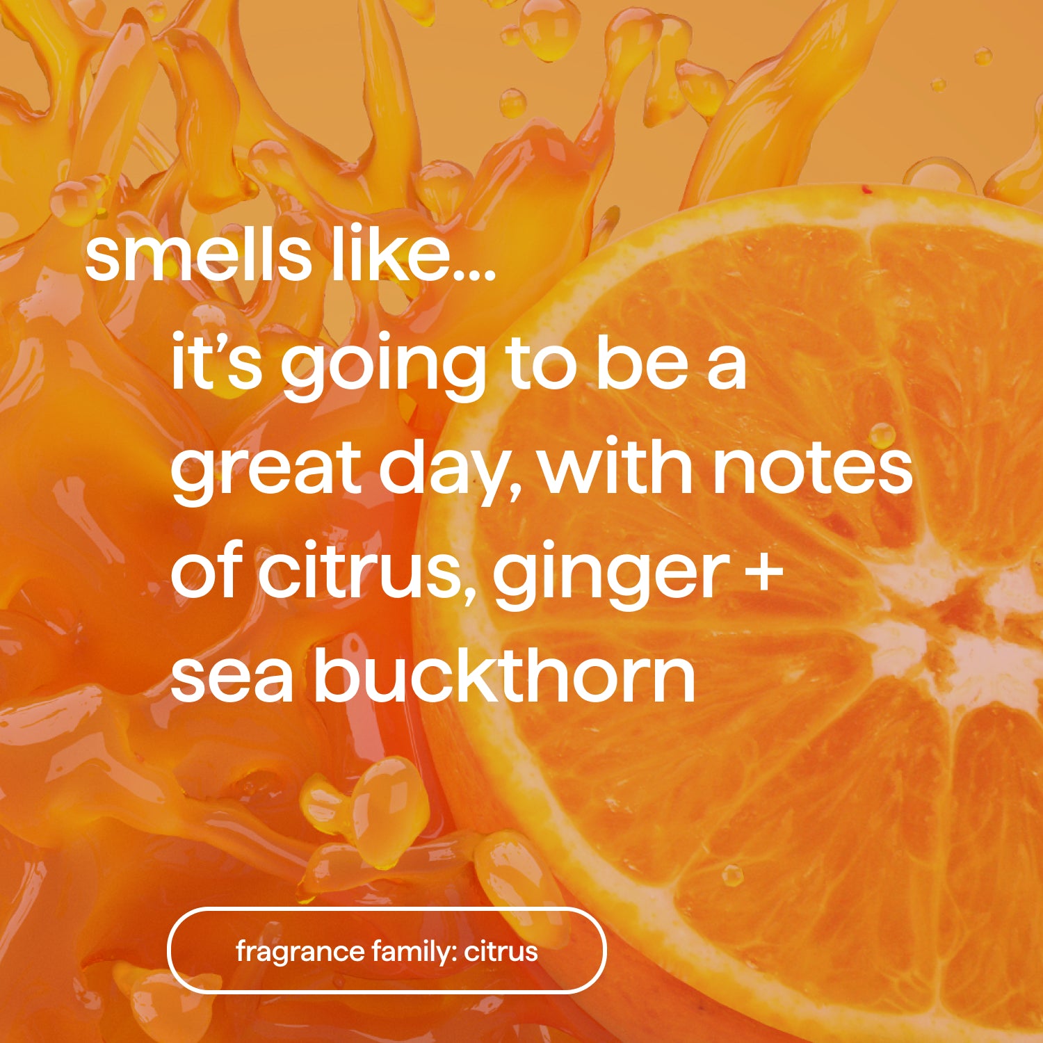 Zesty scents of orange. ginger + sea buckthorn get you smelling like a fresh start. even before your morning cup of joe. Unless you’re the type to bring your coffee in the shower. In which case. more power to you.