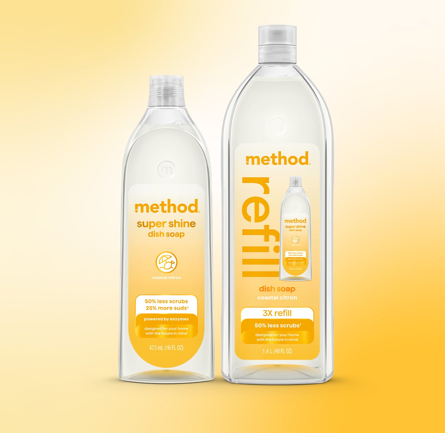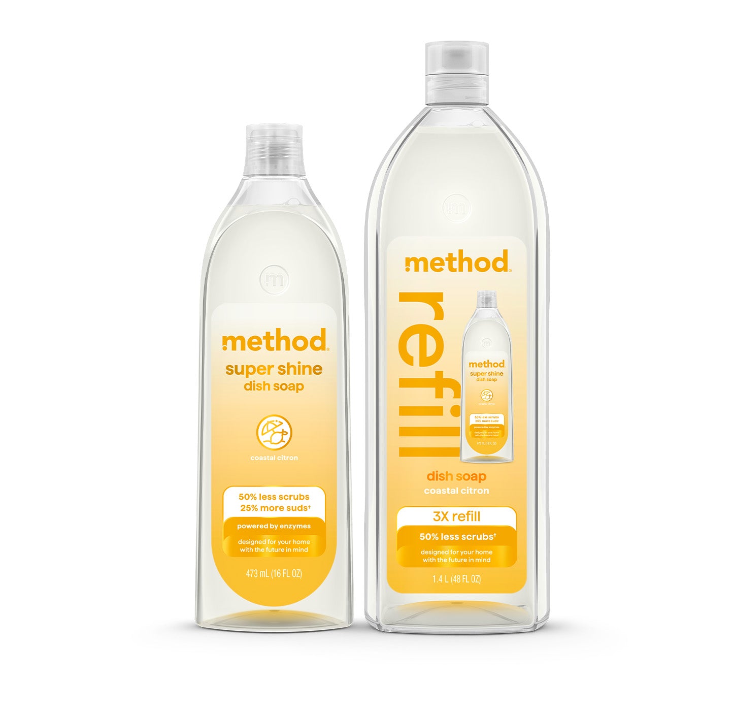 POWERED BY ENZYMES: Removes up to 99% of grease. with 50% less scrubs and 25% more suds* (*vs. original method dish soap)